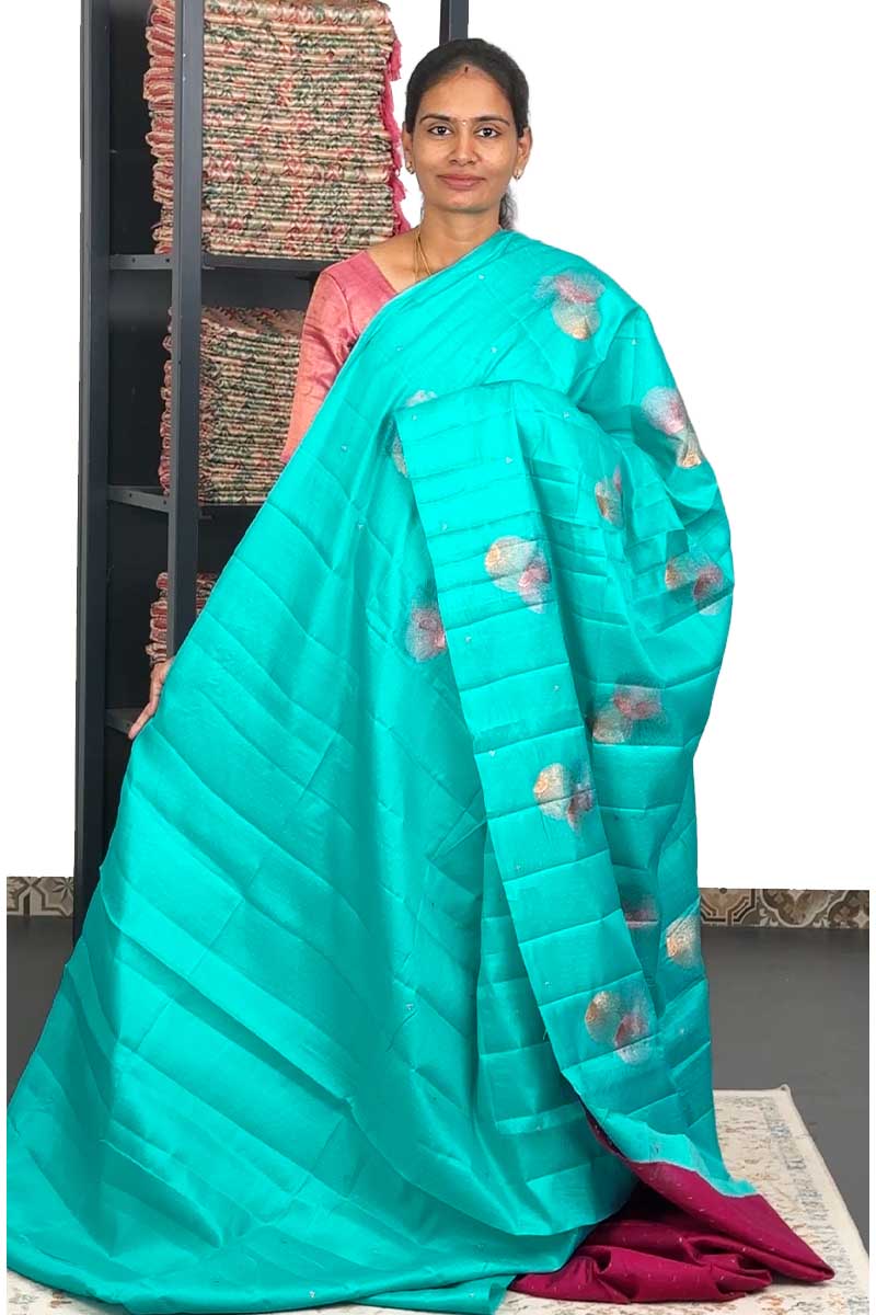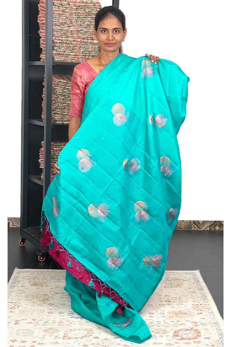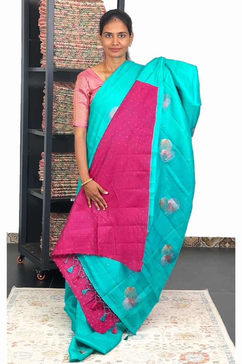 Butter Silk Saree with weaving design | Aqua Blue + Rani Pink