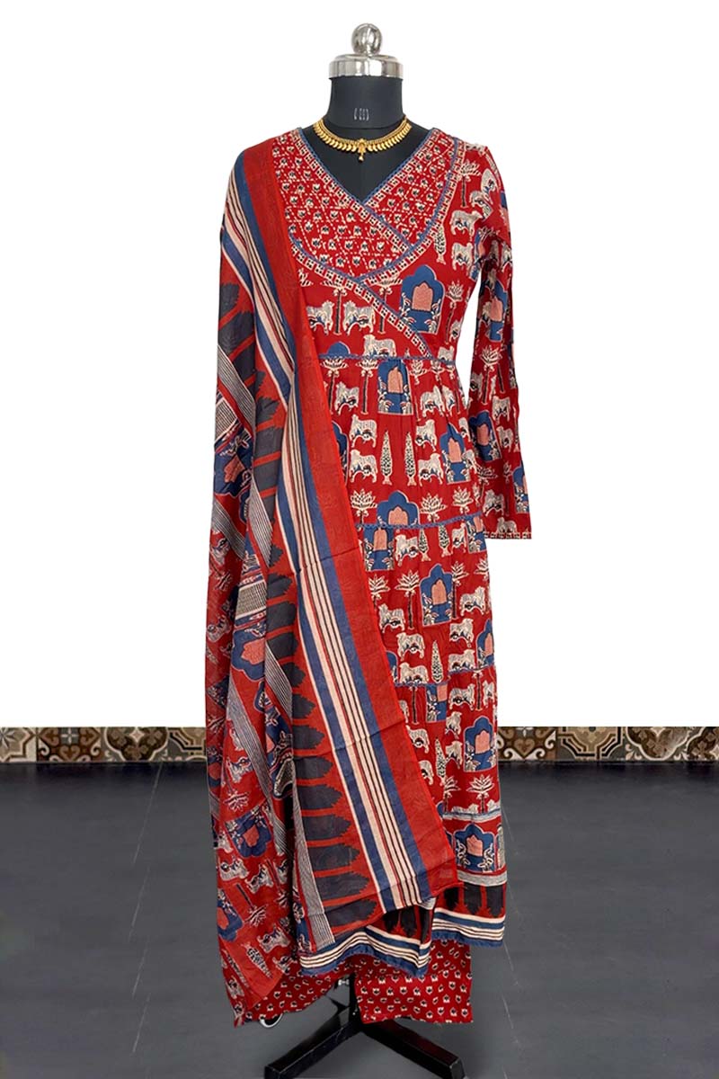 Mul Cotton Stitched Salwar Suit With Printed Design(Top, Bottom & Dupatta) - Maroon