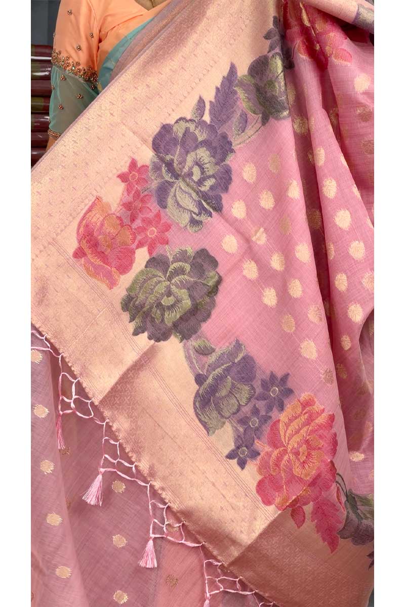 Munga Cotton Saree With Flower Border | Sweet Pink