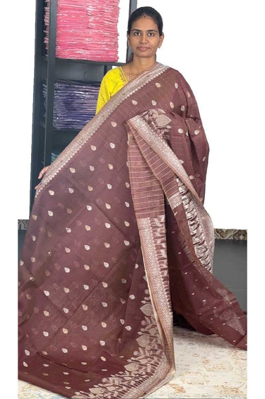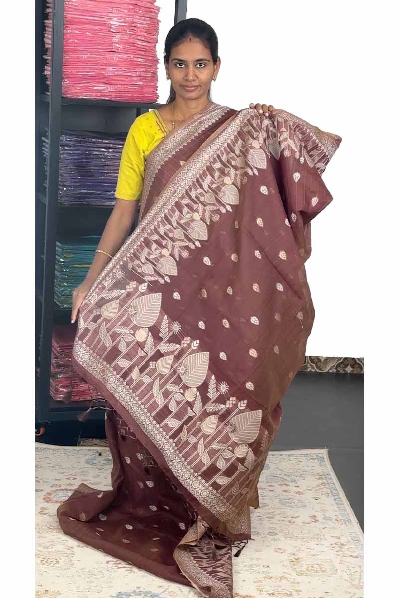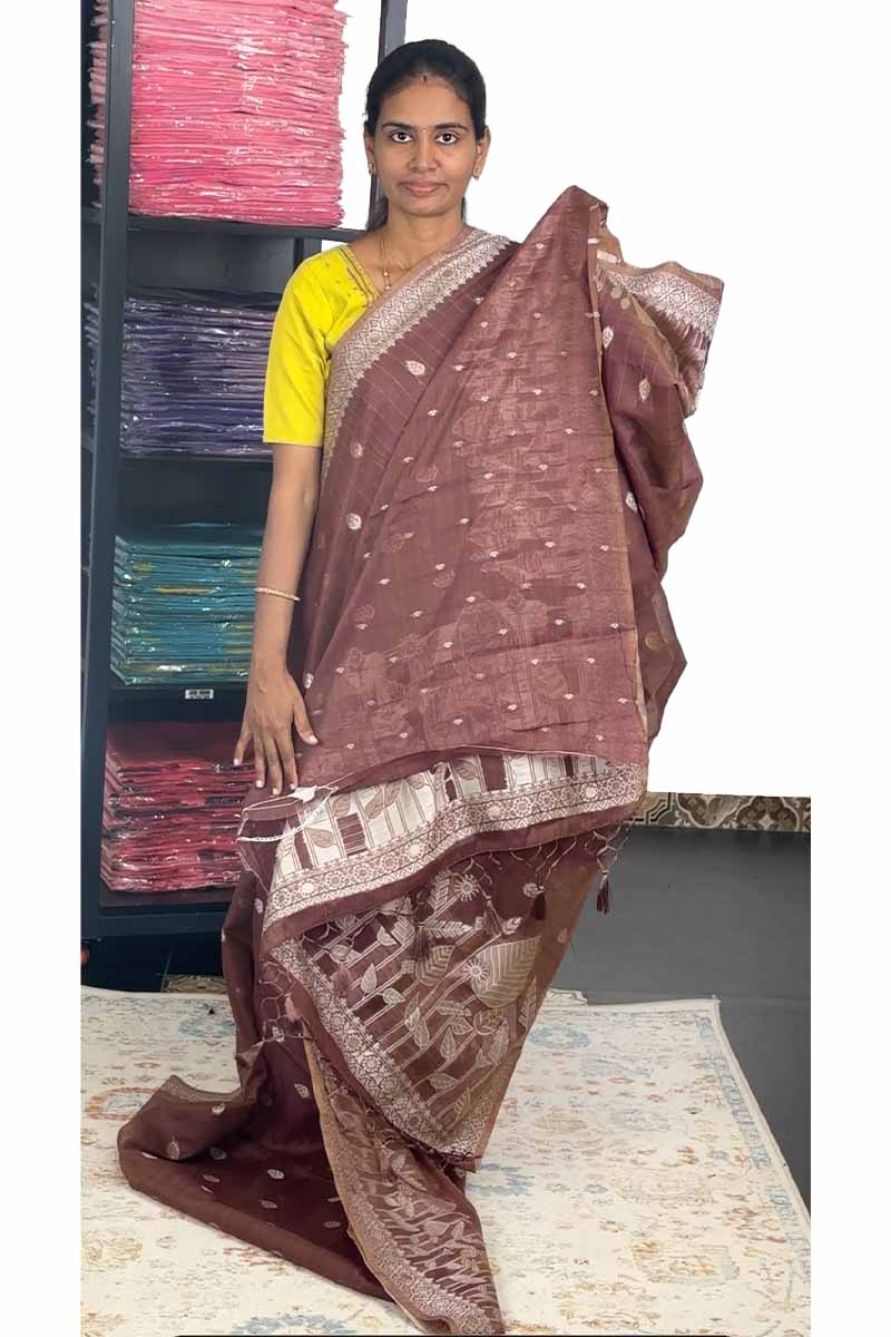 Munga Cotton Saree With Weaving Leaf Design | Chocolate