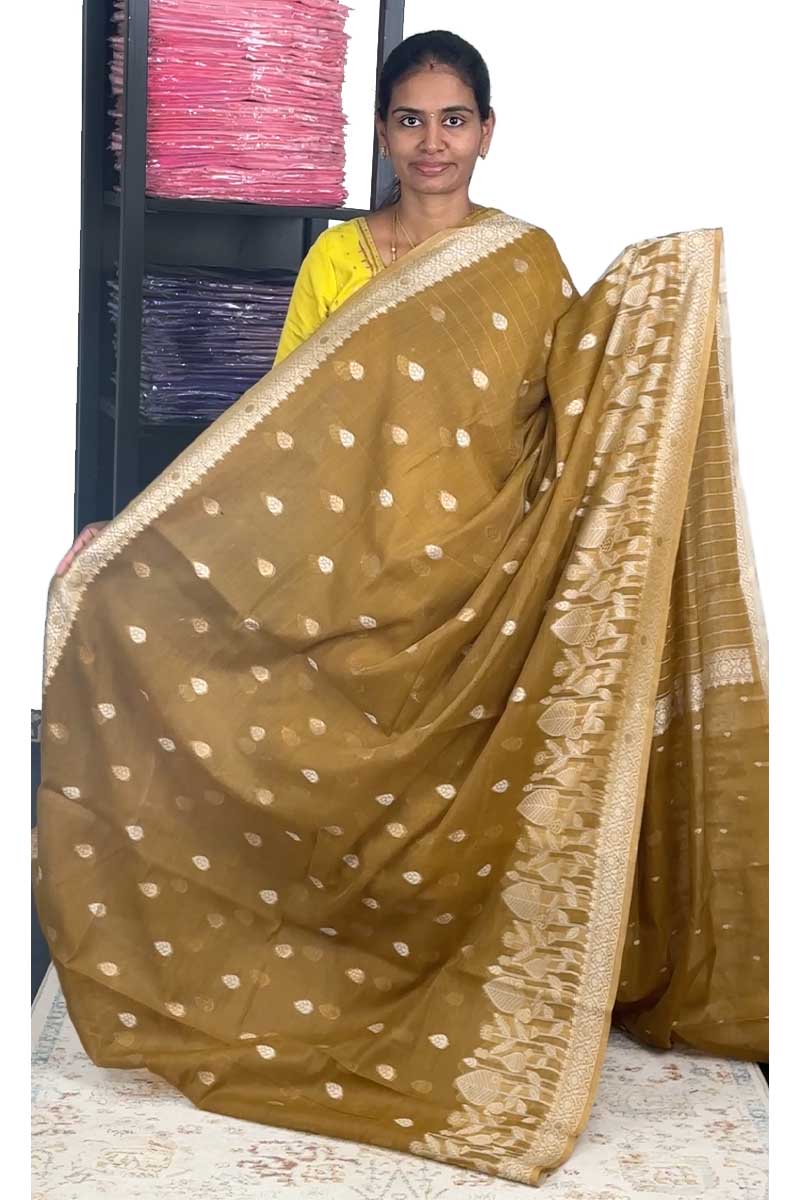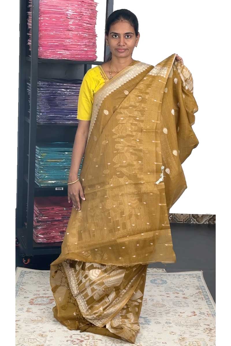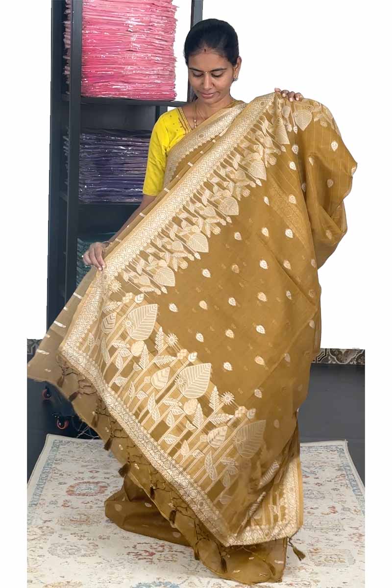 Munga Cotton Saree With Weaving Leaf Design| Camel