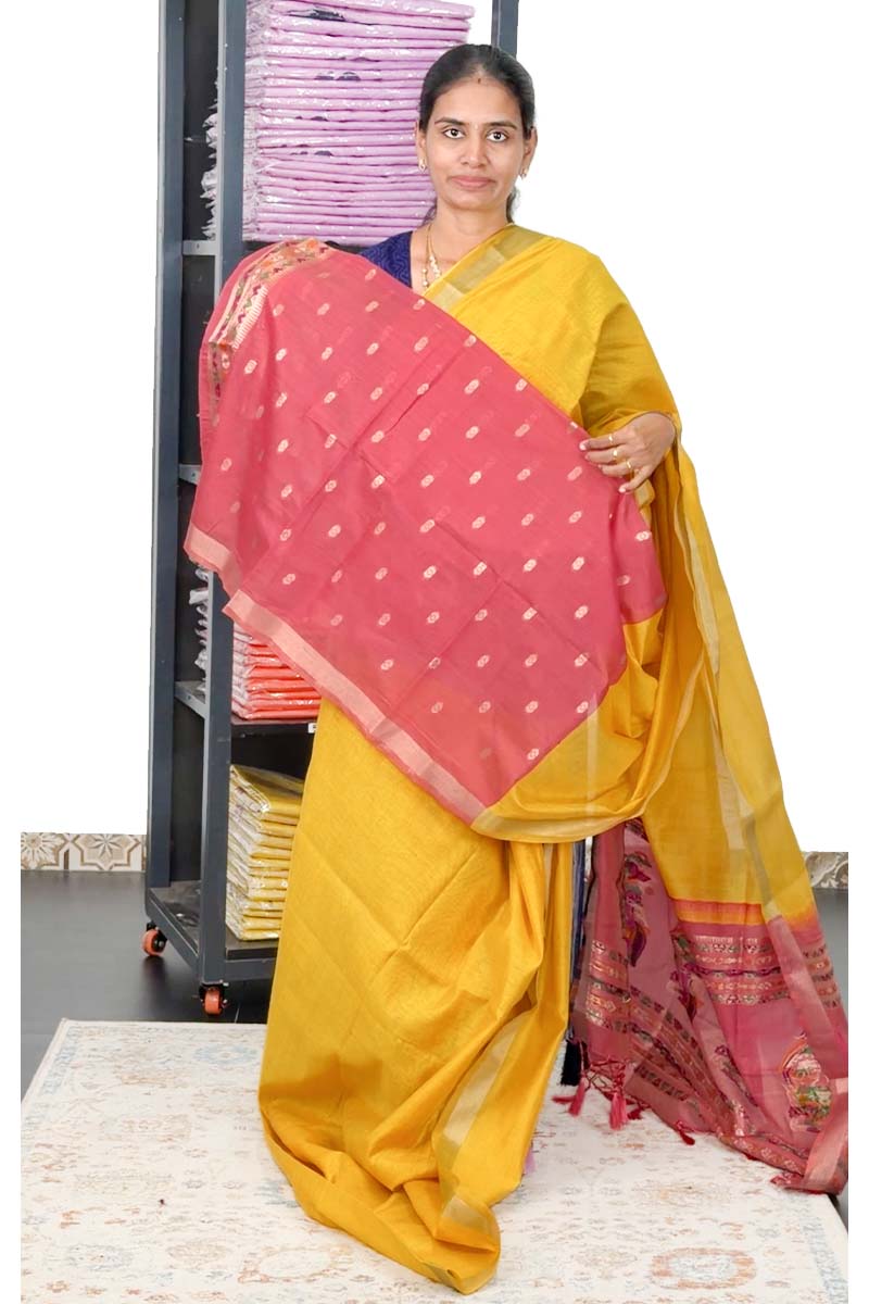 Munga Cotton Saree With Plain Concept | Yellow + Flamingo Pink