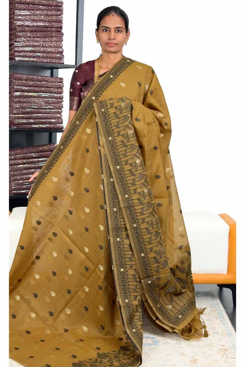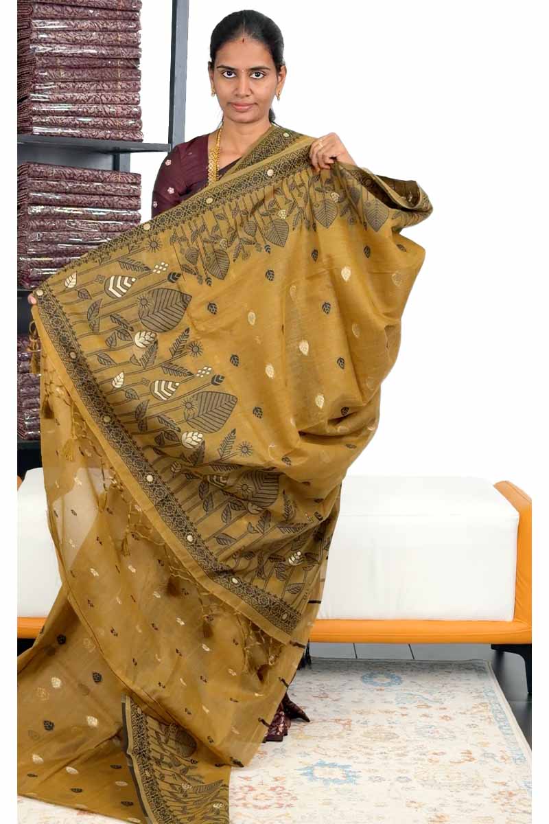 Munga Cotton Saree With Weaving Leaf Design| Citrine Yellow