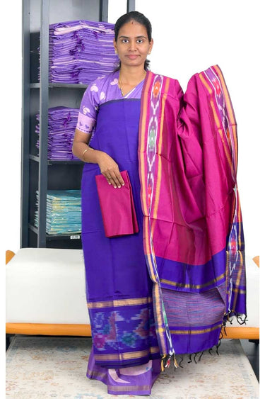 Pochampally Silk Salwar Material (Top, Bottom & Dupatta) - Blue Violet + Fuschia