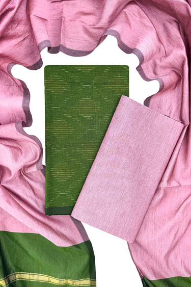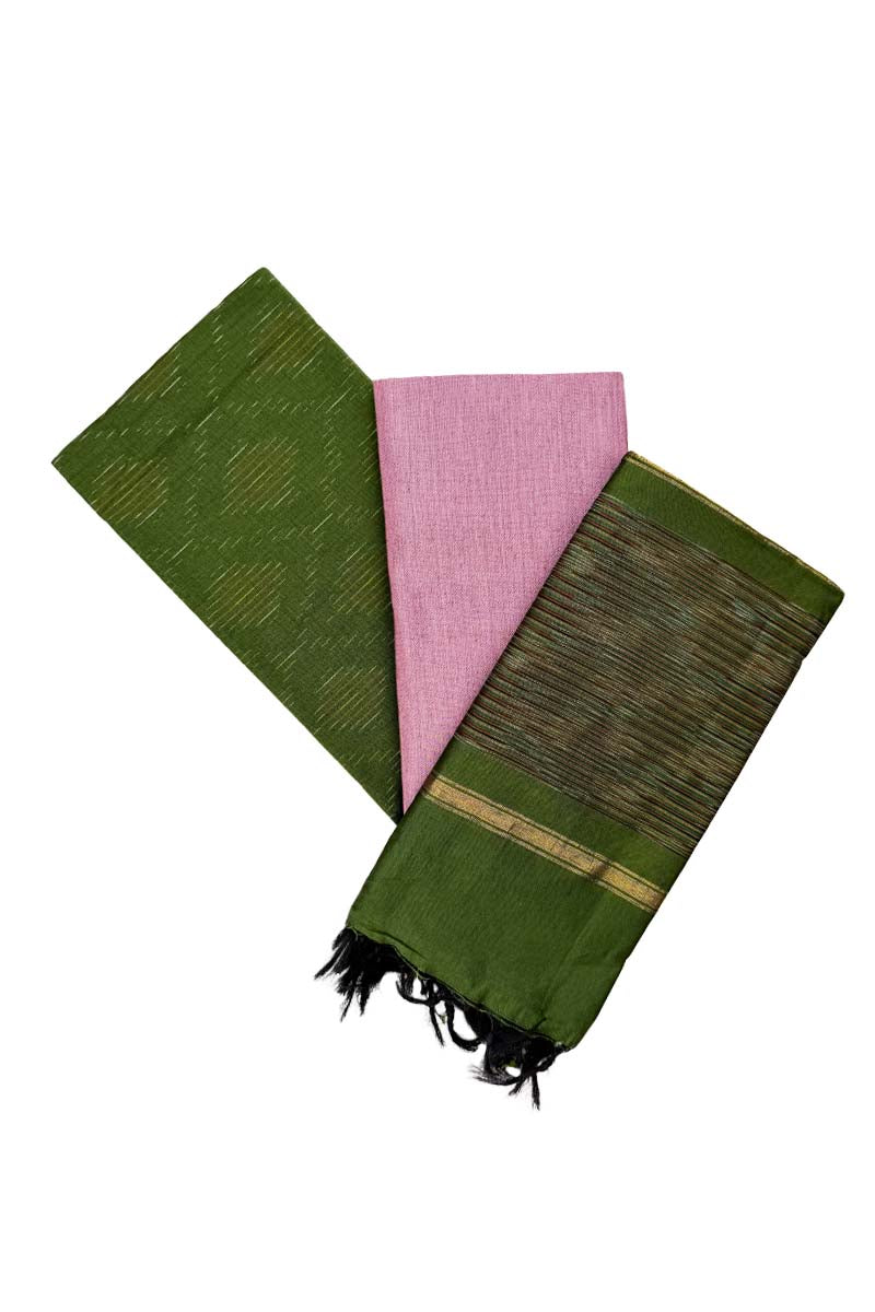 Pochampally Silk Salwar Material (Top, Bottom & Dupatta) - Forest Green + Pastel Pink