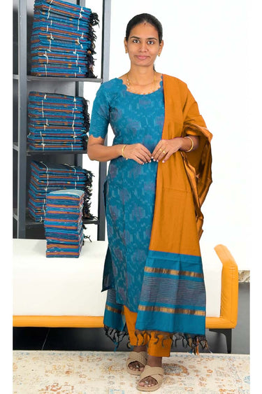 Pochampally Silk Stitched Salwar Suit (Top, Bottom & Dupatta) - Happy Blue + Burnt Orange