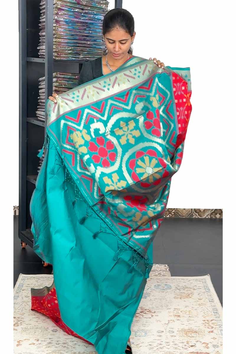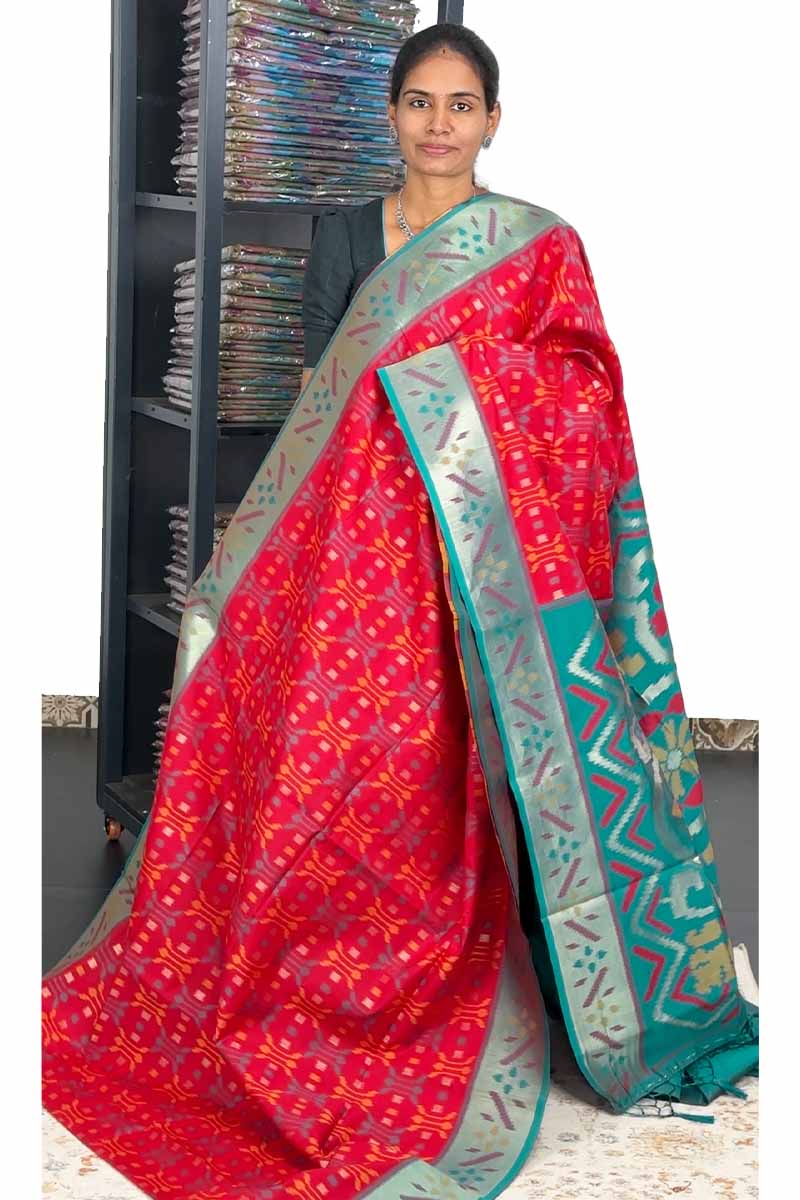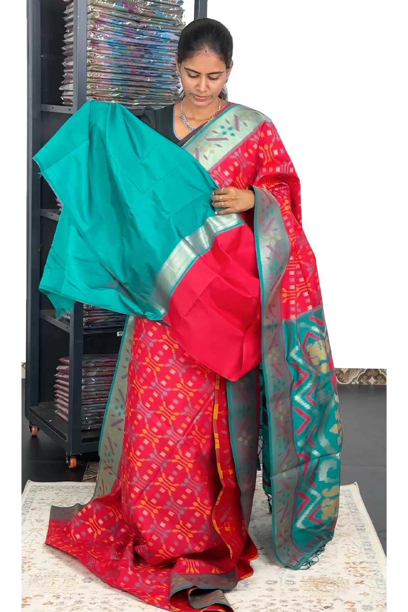 Pochampally Soft Silk Saree With patola Pattern | Pretty Red + Aqua Blue