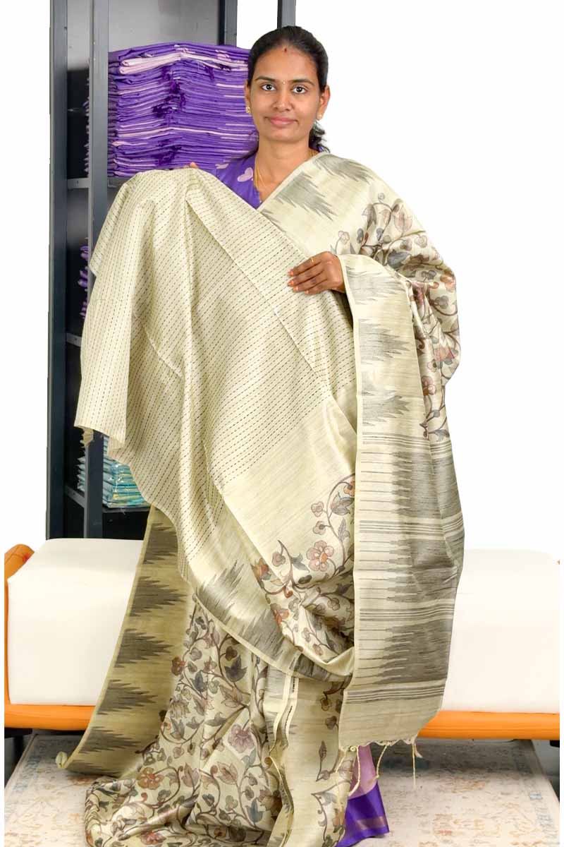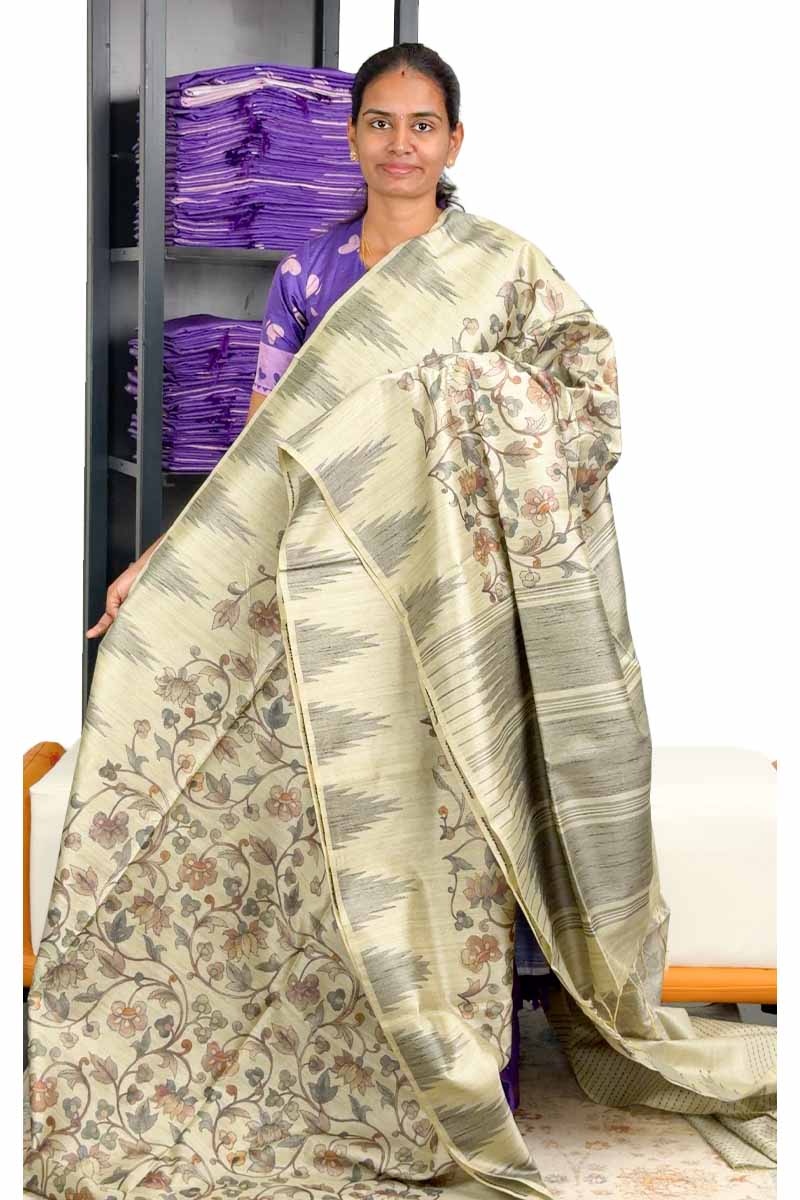 Premium Raw Silk Saree With Kalamkari Design | Tan
