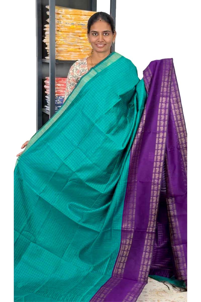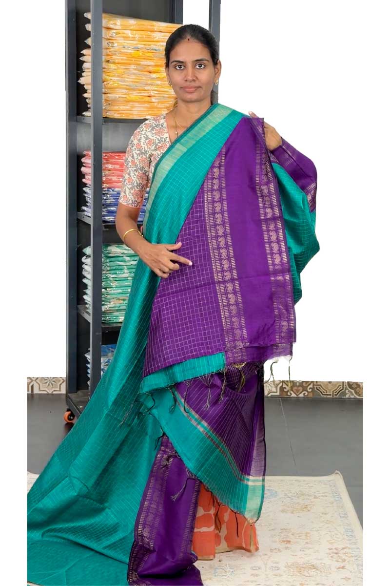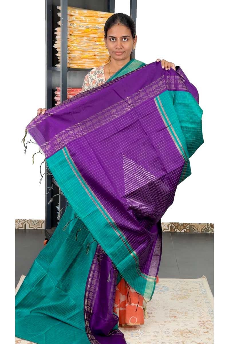 Raw Silk Saree With Mini Chex | Teal+Violet