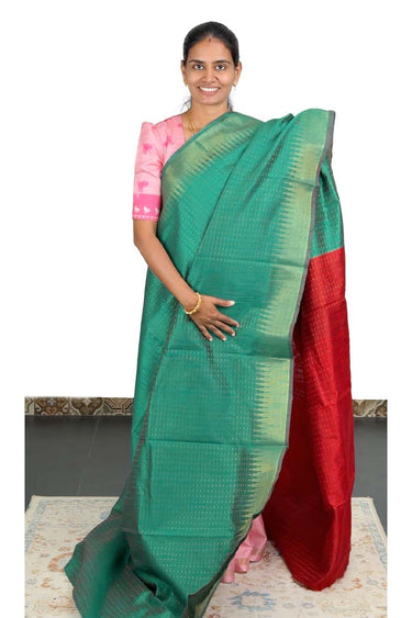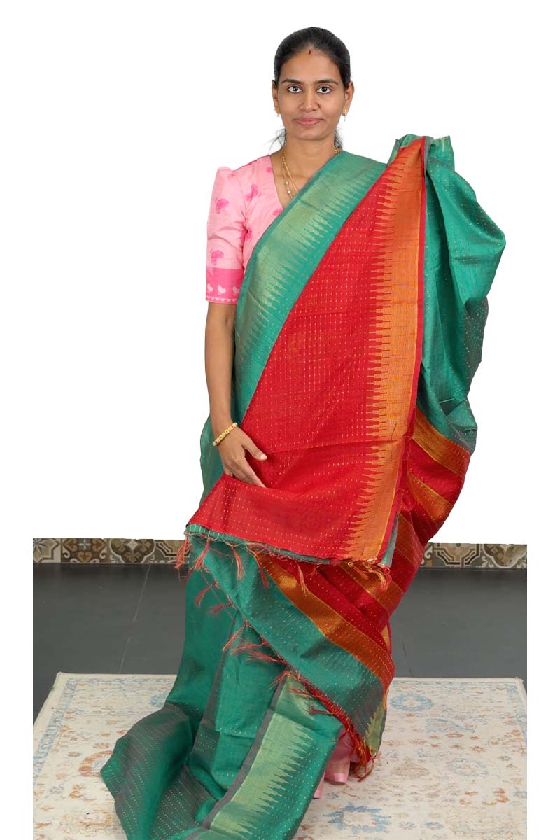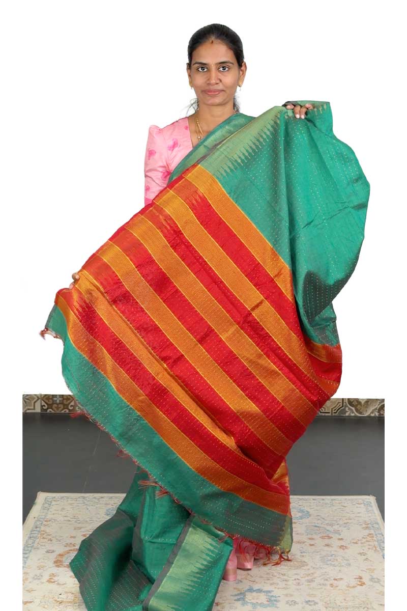 Raw Silk Saree With Temple Border | Aqua Mint + Red