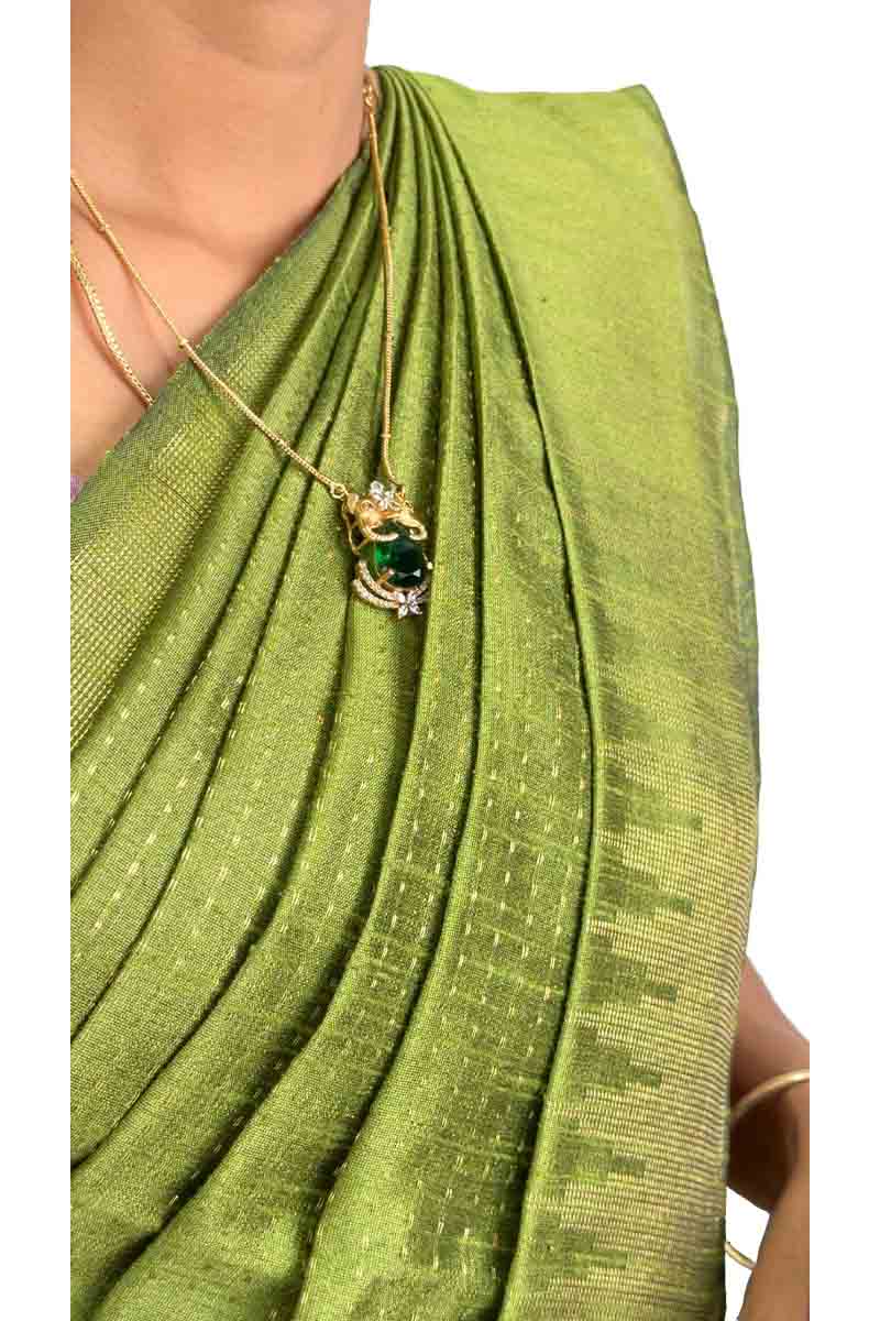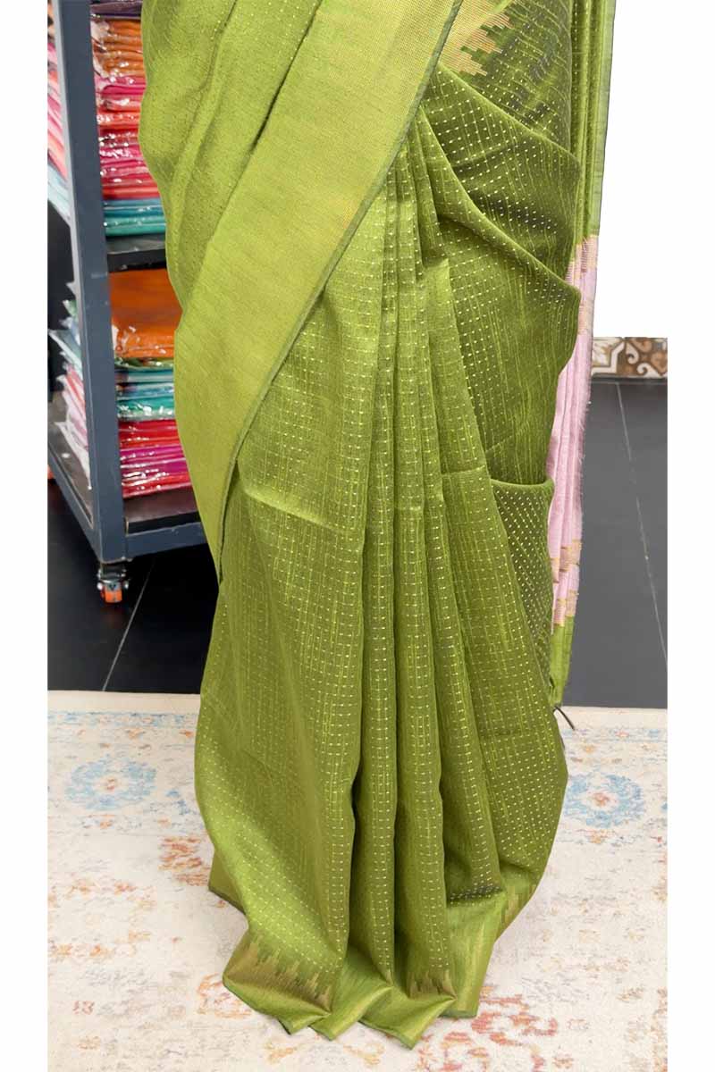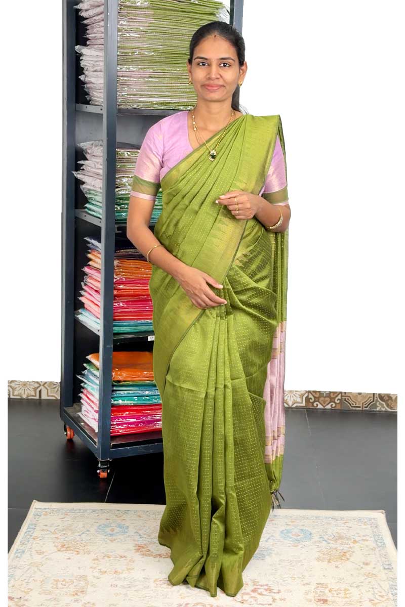 Raw Silk Saree With Temple Border | Gram Green + Lavender