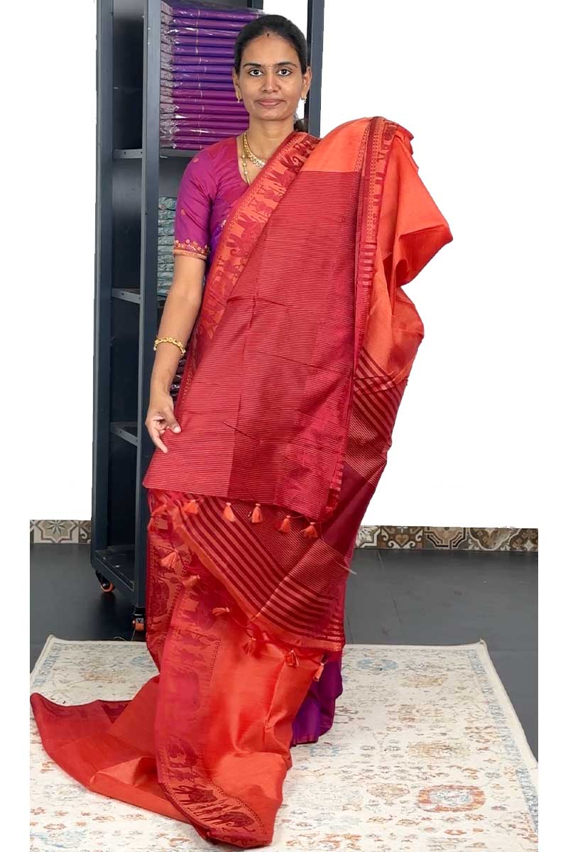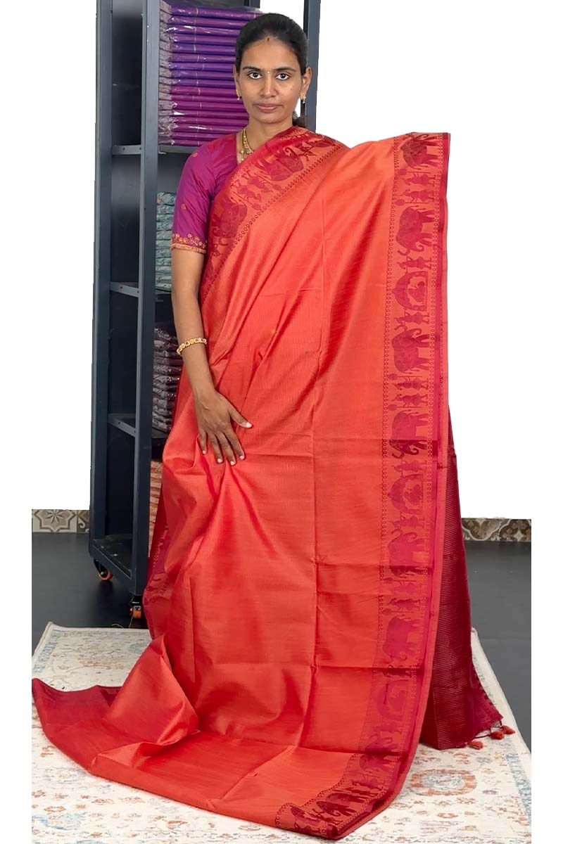 Raw Silk Sarees with Elephant Motif | Coral Orange + Red