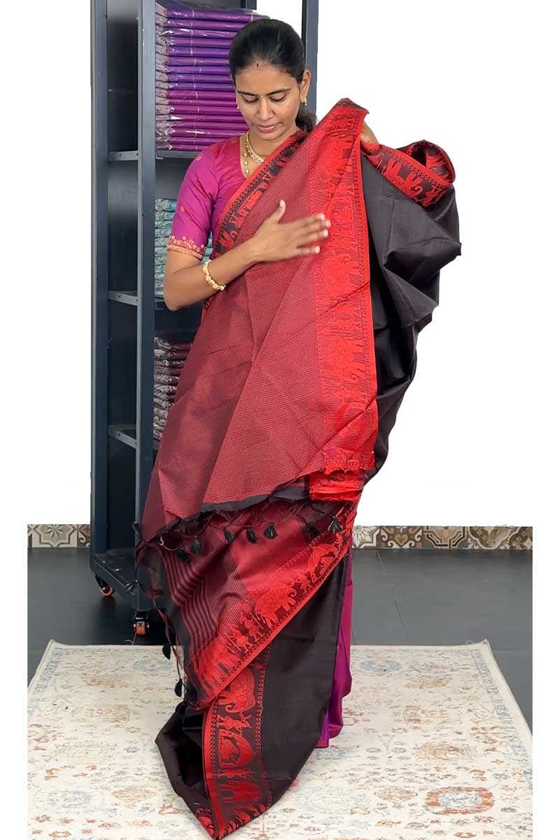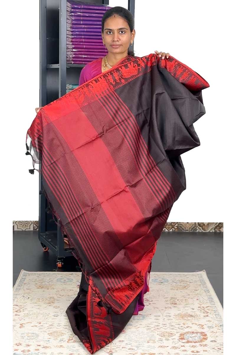Raw Silk Sarees with Elephant Motif | Black + Red