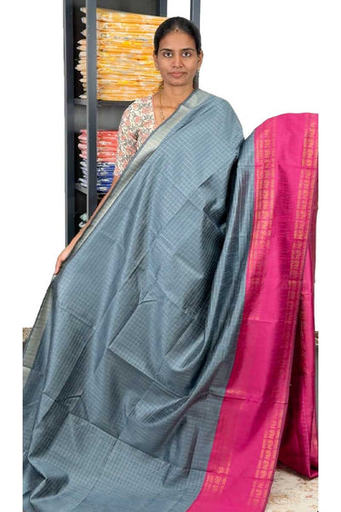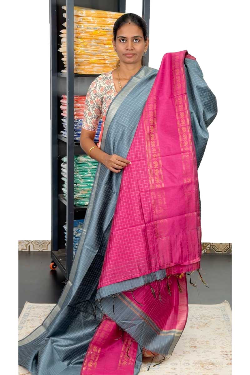 Raw Silk Saree With Mini Chex | State Gray+Hot Pink