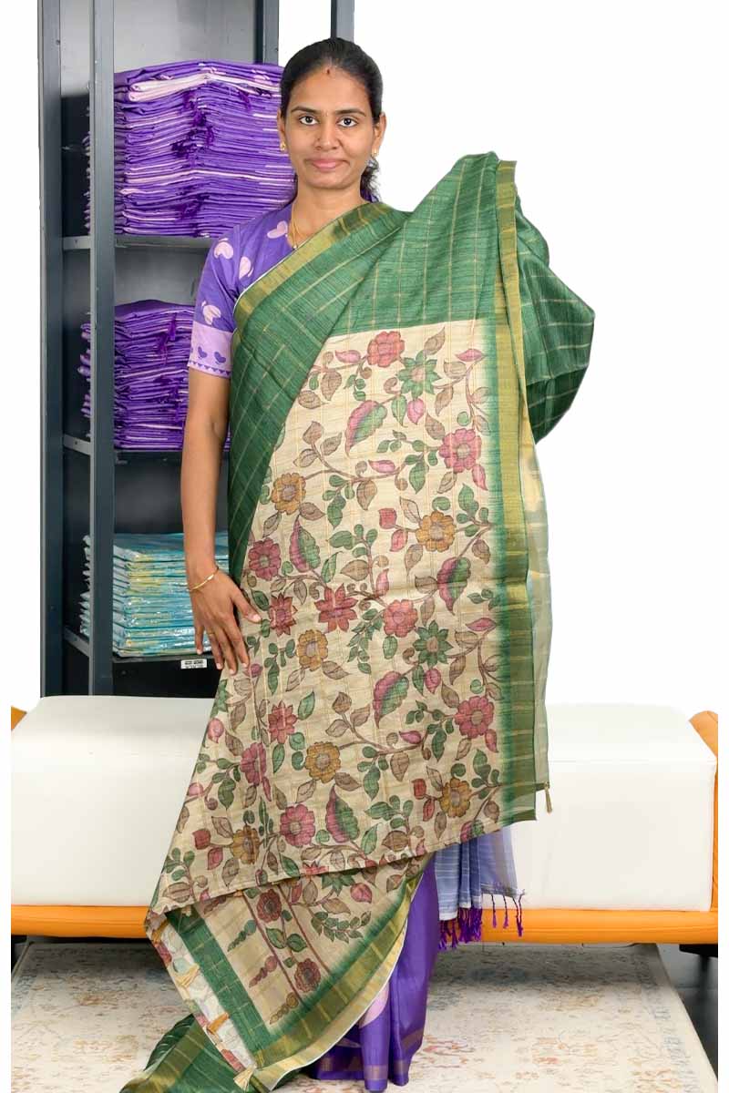 Semi Tussar Saree With Chex Design | Forest Green