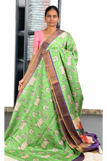 Semi Tussar Saree With Printed Design | Green Grass + Violet