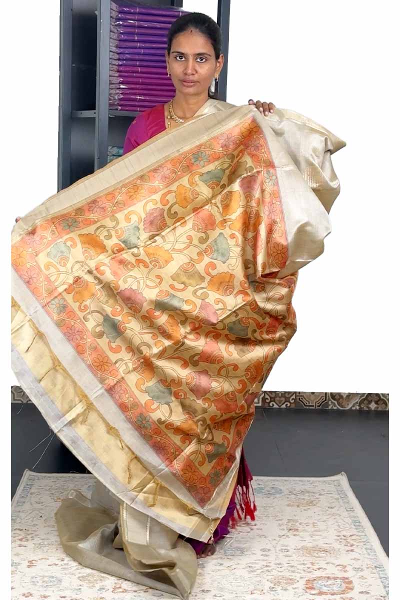 Silk Cotton Saree with Kalamkari Design | Silver Grey