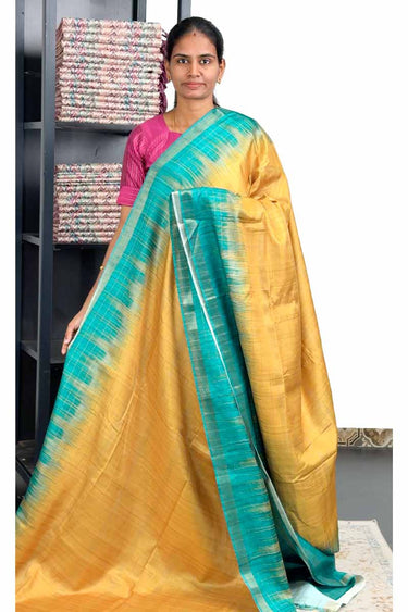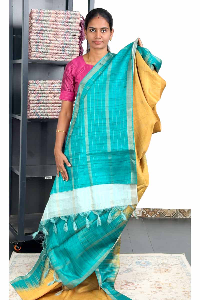 Tussar Silk Saree With Contrast Colours | Yellow + Aqua Mint