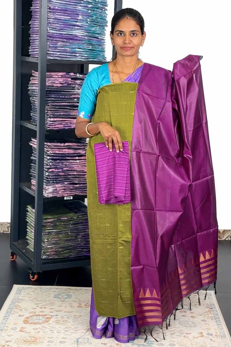 Unstitched Salwar Set - Raw silk| Olive Green + Orchid Purple