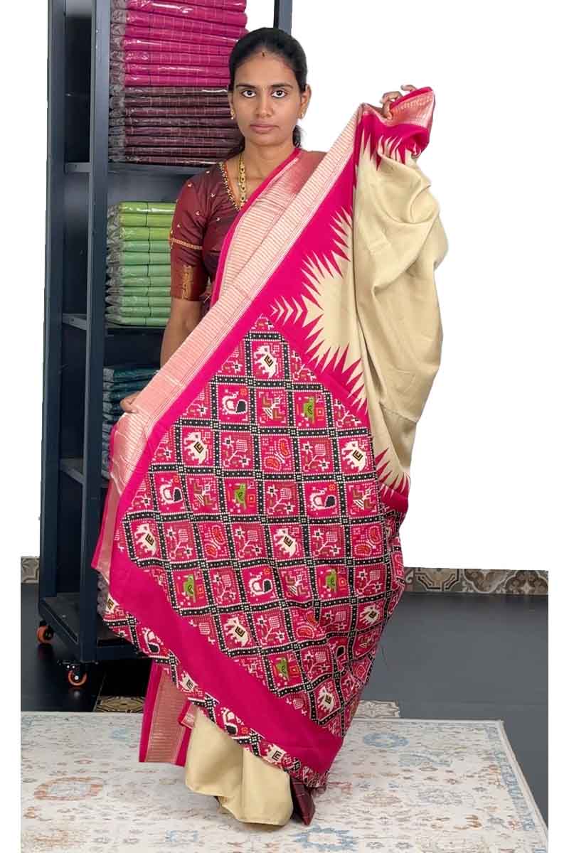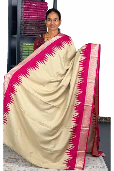 Viscose Dola Saree With Temple Border | Creme Colour+Fuschia