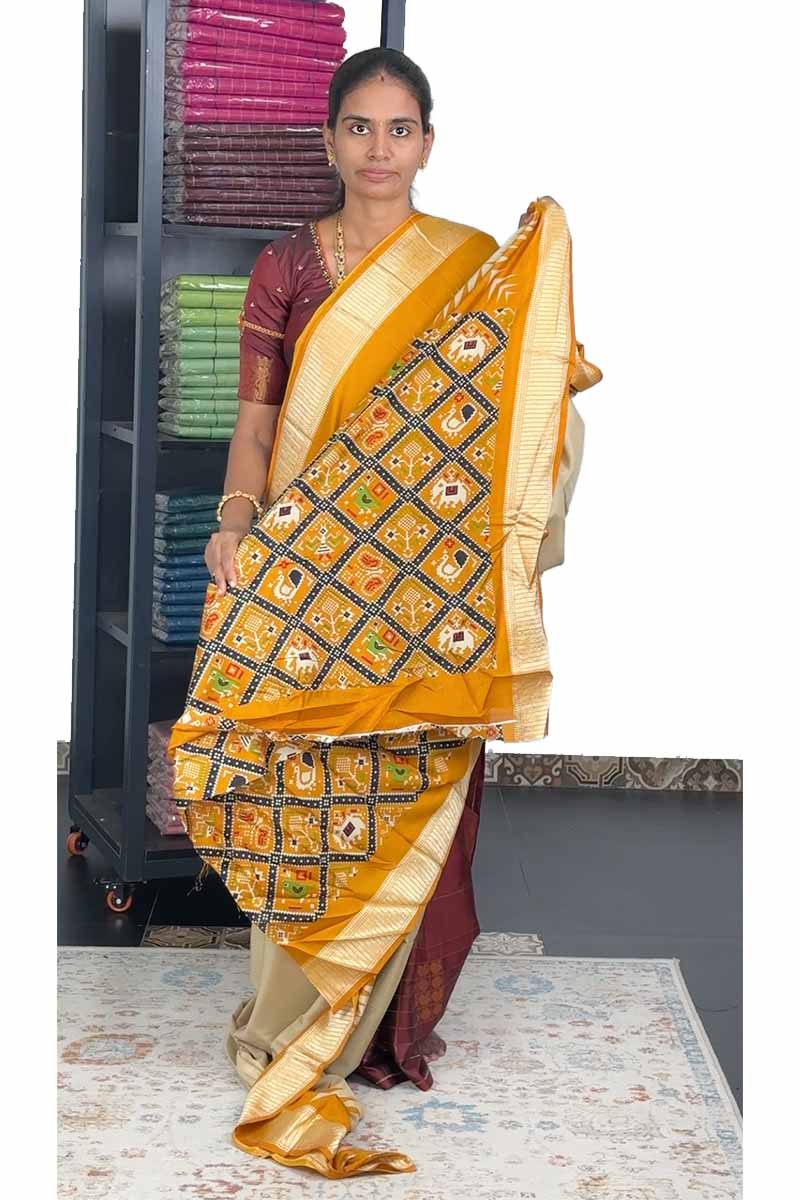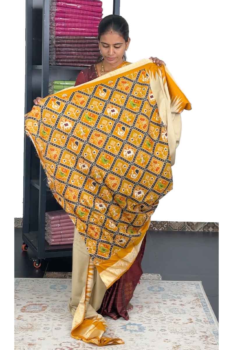 Viscose Dola Saree With Temple Border | Creme Colour+Goldfinch
